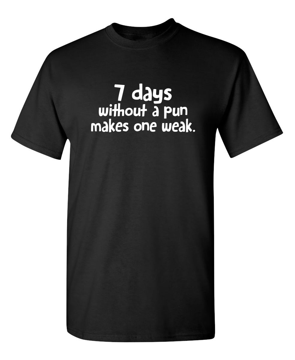 The "7 Days Without A Pun Makes One Weak" T-Shirt features a playful and punny phrase that will bring a smile to your face and those around you. Embrace the power of puns and let your sense of humor shine with this fun and lighthearted design.
