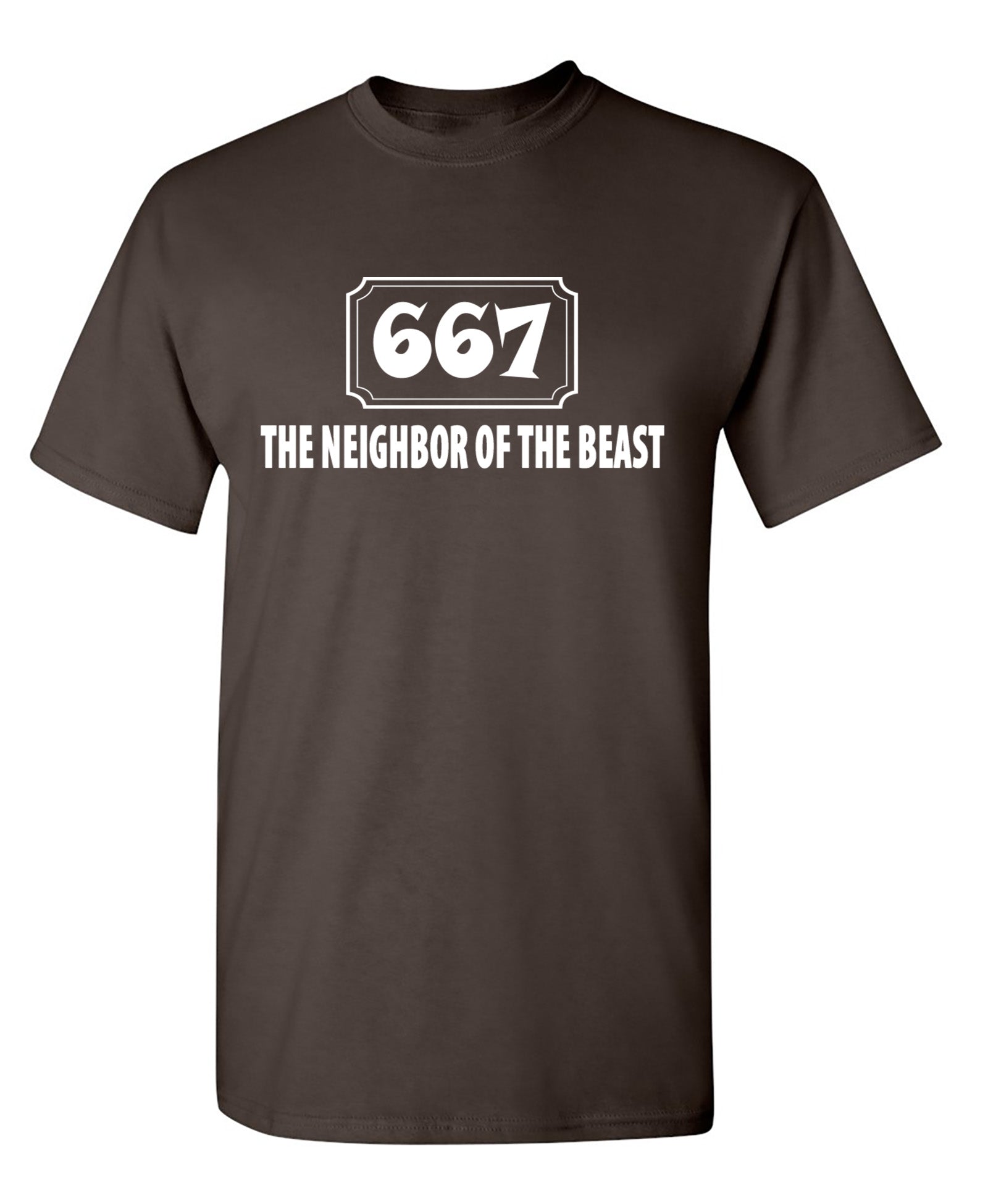 The "667 The Neighbor Of The Beast" T-Shirt features a clever play on words that will surely catch the attention of those around you. With its humorous twist on the iconic "Number of the Beast," this shirt is bound to spark conversations and laughter wherever you go.